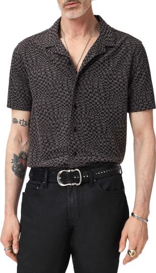 Mesmerize everywhere you go in this camp shirt cut from a jacquard-knit fabric with a surface that features an abstract, distorted tile pattern that adds visual depth and dimension.