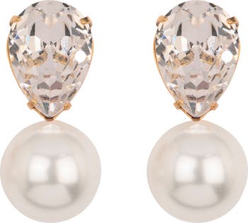 Pear-cut Austrian crystals pair with faux pearls in these handcrafted drop earrings that are stunning in their simplicity.