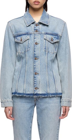 Rugged meets refined in a bleach-baked denim trucker jacket finished with an unfinished hem and cinched at the waist to define the silhouette.