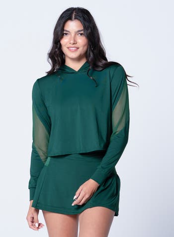 For the sporty woman that loves a shorter fitting hoodie. This fun green throw over has mesh racing stripe paneling around the sleeves and hood in our lightweight performance jersey. Bound to be your new favorite hoodie.