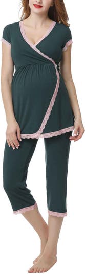 A ultra soft pajama top is designed to adapt to your changing body from pregnancy to motherhood with a flattering surplice neckline, empire waist, and pretty lace trim. A hidden layer along the neck can be pulled aside for easy and discreet nursing. Comfy capri length over belly pant is designed especially for C-section recovery.