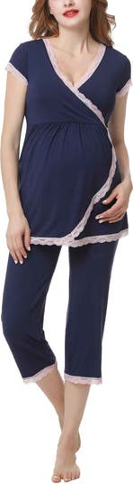 A ultra soft pajama top is designed to adapt to your changing body from pregnancy to motherhood with a flattering surplice neckline, empire waist, and pretty lace trim. A hidden layer along the neck can be pulled aside for easy and discreet nursing. Comfy capri length over belly pant is designed especially for C-section recovery.