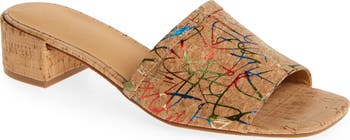 A decorated cork upper and angular square toe define a weekend-ready slide sandal set on a lightly padded footbed and modest block heel.