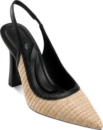 A finely woven upper and smooth faux-leather trims bring textural interplay to a pointy-toe pump set on a subtle flare heel and secured with an elasticized slingback strap.