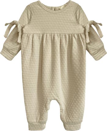 - Wrap your little one in timeless elegance with the Cinnamon Sugar Romper. Crafted in a soft beige hue with delicate textured detailing, this romper exudes warmth and comfort. The tie accents on the long sleeves add a touch of subtle playfulness, while the gathered high waistline gives it a sweet, relaxed silhouette. Perfectly designed for cozy moments and effortless style, it's a must-have for your baby girl's wardrobe. Fabric Care Machine Wash Cold