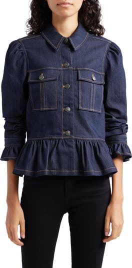 Ruffles at the cuffs and hem put a playful spin on a tried-and-true denim jacket complete with contrast topstitching.