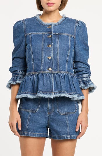 The beloved denim jacket gets a dainty makeover in an option with ruched sleeves and a perky peplum finish.