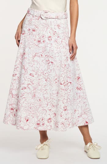 A sketchbook full of cheerful blooms illustrates the style story of an ankle-skimming skirt cut from stretch-kissed cotton.