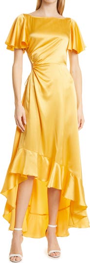 Fashioned from gliding silk in a warm daffodil hue, this dress flaunts a single side cutout and trendy high-low hem.