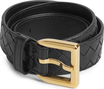 The brand's iconic weave crafted from handwoven strips of leather textures this belt secured with a gleaming goldtone buckle.