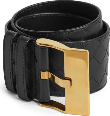 The brand's iconic weave crafted from handwoven strips of leather textures this wide belt secured with a gleaming goldtone buckle.