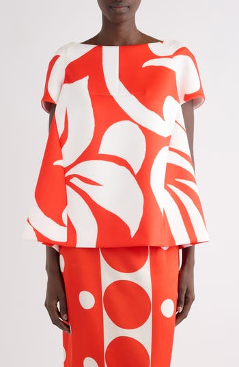 Van Noten successor Julian Klausner continues the Belgian brand's bold color/pattern play with this sculptural trapeze top, where abstract swirls cascade across smooth, densely knit scuba fabric lined with lustrous satin.
