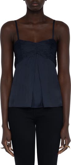 This babydoll camisole leans into its lingerie inspiration in the silky drape of lustrous satin. The pleated bodice gives way to soft gathers and a shirred back panel that offers flexible support without constricting.