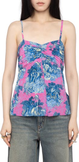 A jungle's worth of bold, bright blooms springs forth against a canvas of lightweight crepe on this camisole, where a pleated bodice gives way to soft gathers and a shirred back panel that offers flexible support without constricting.