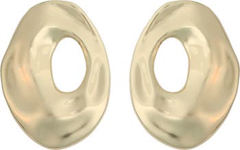 A hammered finish brings organic-inspired shape to circular earrings finished in high-shine 14-karat gold plate.