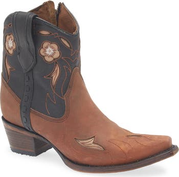 Dainty floral embroidery refreshes the Western aesthetic of an abbreviated leather boot complete with a cushioned footbed.
