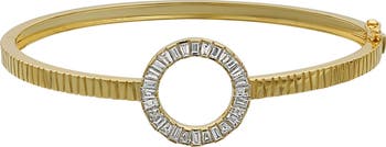 A circle of 28 tapered baguette diamonds illuminates an etched bangle handcrafted from gleaming 18-karat gold.