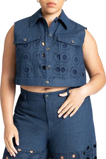 A sleeveless denim shirt with chest pockets and a crisp, waist-length cut.