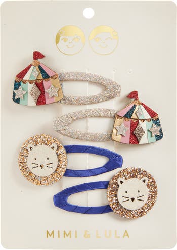 This set of hair clips will add a playful touch to your kids updo with their lion and circus tent appliqués.