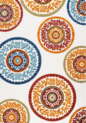 Inspired by antique Suzani patterns, this indoor-outdoor rug will cheer up a kitchen, living room, bedroom or dining room. The multicolored design is an easy maintenance solution for homes with kids and pets. Outdoors, this rug adds a splash of color and Moroccan style to your patio or porch.