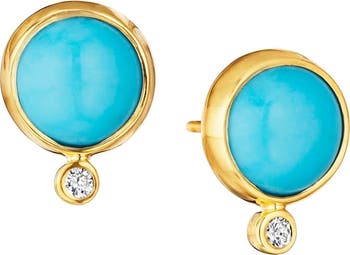 Deep and quietly striking, the Cirra Stud Earrings center on smooth cabochon sleeping beauty turquoise in a rich hue, set in polished 18k yellow gold. A single diamond drop sits just beneath each stone, adding a subtle point of light and movement. Sculptural yet effortless, they bring depth, warmth, and a sense of quiet confidence to everyday wear.