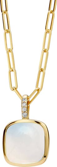 Refined and versatile, this pendant necklace captures Syna’s signature balance of color and form in an effortless everyday piece. Crafted in 18K yellow gold, a softly contoured gemstone is accented with a delicate touch of diamond brilliance, suspended from a fine paperclip chain. Designed for ease and fluidity, it offers a polished yet understated presence that layers beautifully or stands on its own.