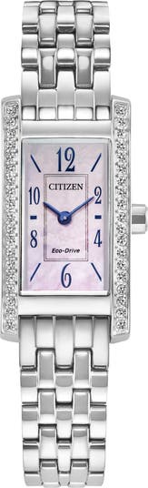 Movement: Three-hand Japanese Eco-Drive solar movement. Solar movement: powered by a battery that is recharged by exposure to sunlight or artificial light.