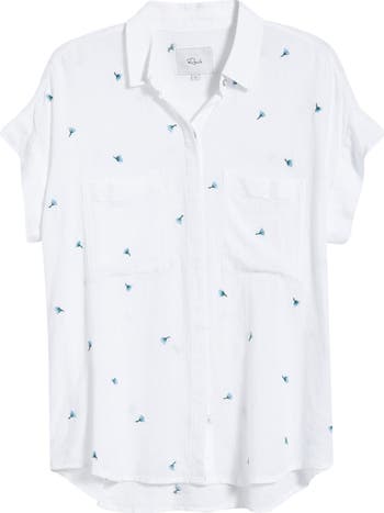 This cool linen-blend shirt is covered in sweet embroidered flowers and framed with abbreviated sleeves to further the breezy vibe.