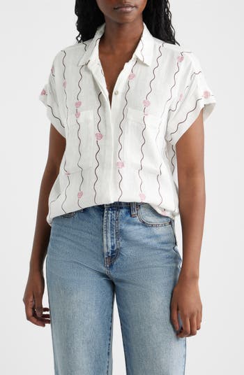 This cool linen-blend shirt is marked wavy striped with seashells and framed with abbreviated sleeves to further the breezy vibe.