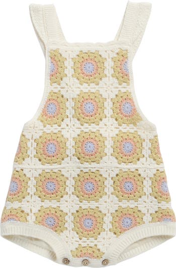 Crochet granny squares bring retro flair to this precious cotton romper that's made with buttons between the legs, making diaper changes quick and easy.