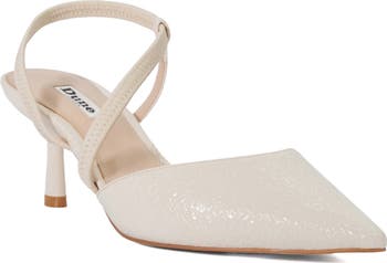 A subtly textured finish heightens the modern allure of an asymmetric pointy-toe pump lifted by a just-right heel.