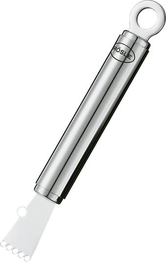 The Rosle Citrus Zester with Canelle is a versatile kitchen tool for zesting citrus fruits and creating beautiful garnishes. Its dual blades work for both prep and presentation, with a stainless steel body and comfortable round handle.