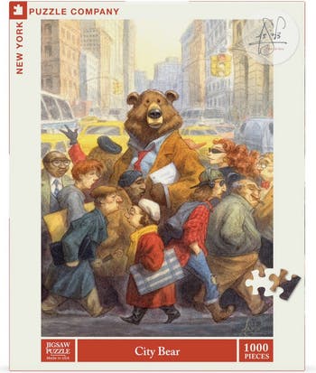 Dive into the humor and charm of Peter de Sève's delightful artwork with the "City Bear" 1000-piece puzzle. This captivating image features a large brown bear, dressed sharply in a suit and tie and carrying papers, looking utterly surprised to find himself caught in the chaotic flow of bustling commuters at a busy city crosswalk. The detailed illustration captures the energy and movement of city life while adding a playful twist that makes this puzzle both entertaining and challenging.\r\n\r\nEach of the 1000 pieces is random die-cut, ensuring that no two are alike, adding to the joy and complexity of the puzzle experience. Crafted with care in the USA, the puzzle reflects high-quality craftsmanship and attention to detail. With intricate visuals and a touch of humor, "City Bear" is perfect for seasoned puzzlers who appreciate imaginative artwork and a bit of a challenge. Whether you work on it solo or enjoy piecing it together with loved ones, this puzzle promises hours of fun and a finished scene that's worth displaying.