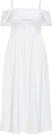 A corseted bodice shapes the silhouette of this shoulder-baring maxi finished with a flowy side-slit skirt that sways with every step.