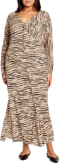 A fierce zebra print covers this slinky long-sleeve maxi dress detailed with curve-highlighting frills and a dainty bow at the neckline.