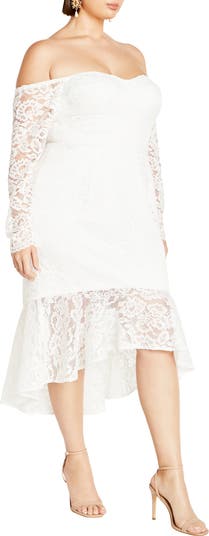 Impress on date night in this charming dress cut from floral lace and complemented by sheer long sleeves and an off-the-shoulder sweetheart neckline.