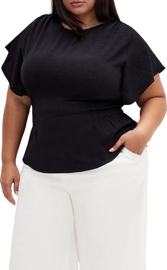 Cut from glossy crinkled satin, this polished top is sweetened by fluttering sleeves for graceful movement and finished with a flared peplum that shapes its silhouette.