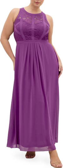 A paneled lace bodice brings elegant texture to this sleeveless maxi dress designed for graceful movement and special occasions. The crewneck and racerback silhouette gives the lace bodice a modern, clean-lined look, while the layered chiffon skirt falls in soft pleats that move beautifully with every step.