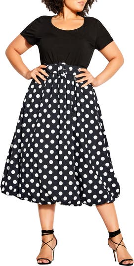 A bubble-hem skirt covered in bold polka dots adds some glamour to this belted midi dress with a solid stretch-cotton bodice.