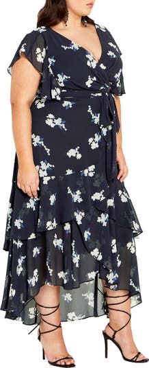 A fabulous floral print romances this faux-wrap chiffon midi designed with a waist-defining sash and a tiered, ruffled high-low hem.