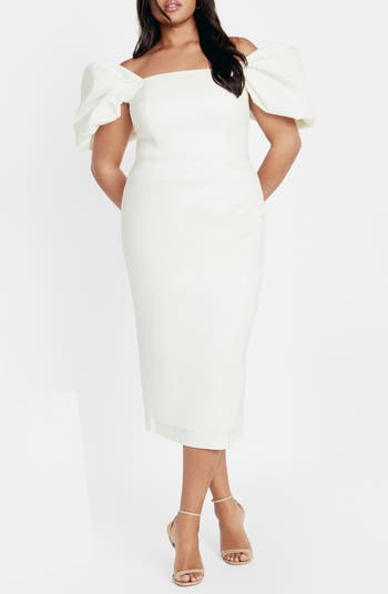 Voluminous puff sleeves dip off the shoulders of this fitted sheath made with shaping bodice boning and textured with rippled ruching.