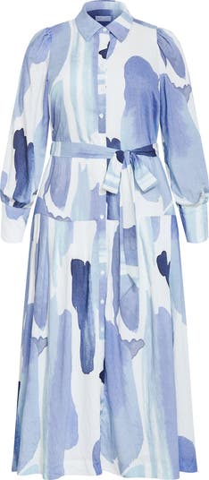 An adjustable tie belt accentuates the waist of a long-sleeve shirtdress in an artistic floral print.