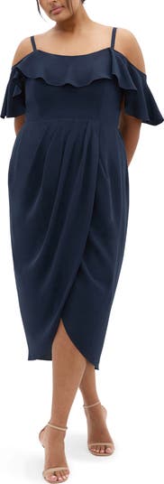 Sharp pleats texture and shape this shoulder-showing cocktail dress made with a fluttering neckline ruffles and finished with a wrapped tulip-hem skirt. Slender adjustable straps give comfort and support to this evening-out look.