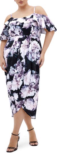 Floral prints splash across this romantic faux-wrap midi dress framed by shoulder-baring sleeves and a popover ruffle.