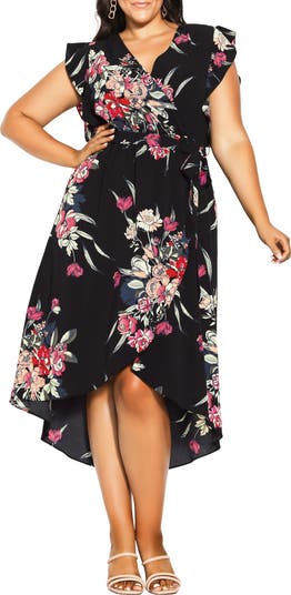 A high-low hemline allows you to show off a little skin each time you slip into this flutter-sleeve floral-print dress.