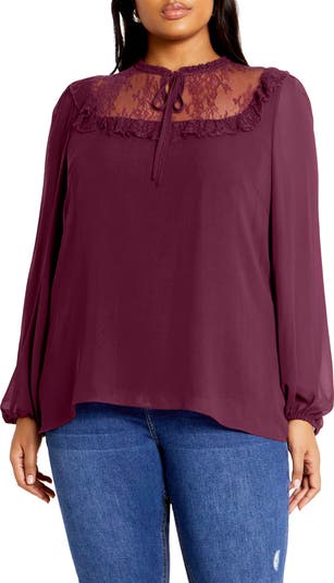 A lacy yoke romances this puff-shoulder top designed with a dainty neck tie and sheer sleeves.