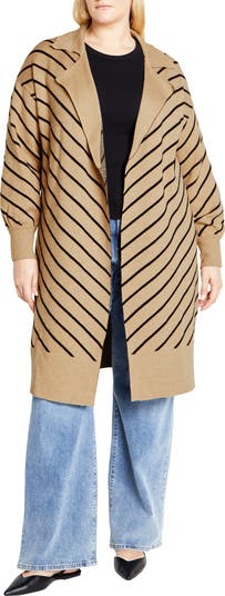 Sleek chevron stripes stand out on an endlessly layerable cardigan framed by notched lapels and gently puffed balloon sleeves.