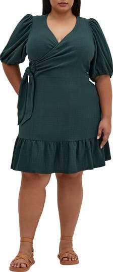 Perfect for a day or night out, this charming faux-wrap dress is cut from a crinkled, stretchy knit and framed by a fluttery ruffled hem.