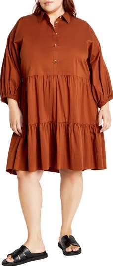 Billowy sleeves frame a winsome cotton-blend shirtdress fashioned in a tiered silhouette and finished with handy side pockets.