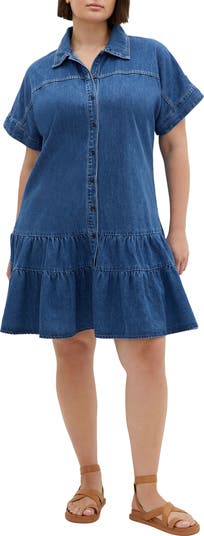 A tiered skirt adds an extra bit of dimension to a denim shirtdress that's sure to be a casual style go-to.